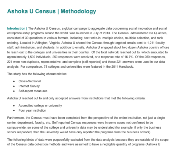 The Ashoka U Census was a global campaign to aggregate data concerning social innovation and social entrepreneurship programs around the world. Below is the methodology I used to collect data for the Census using Qualtrics.