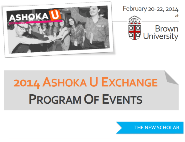 Every year, Ashoka U runs a three day conference where participants come together to share how they use their classrooms, departments, institutions, communities and beyond to catalyze long-term change and social impact. Below is the program from the 2014 Brown University conference that I designed.