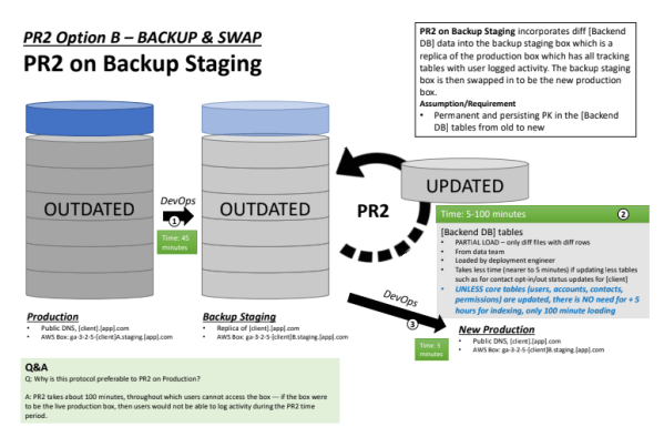 In order to convey the various potential options for processes for updating a very large database with live users, I created the following diagrams.